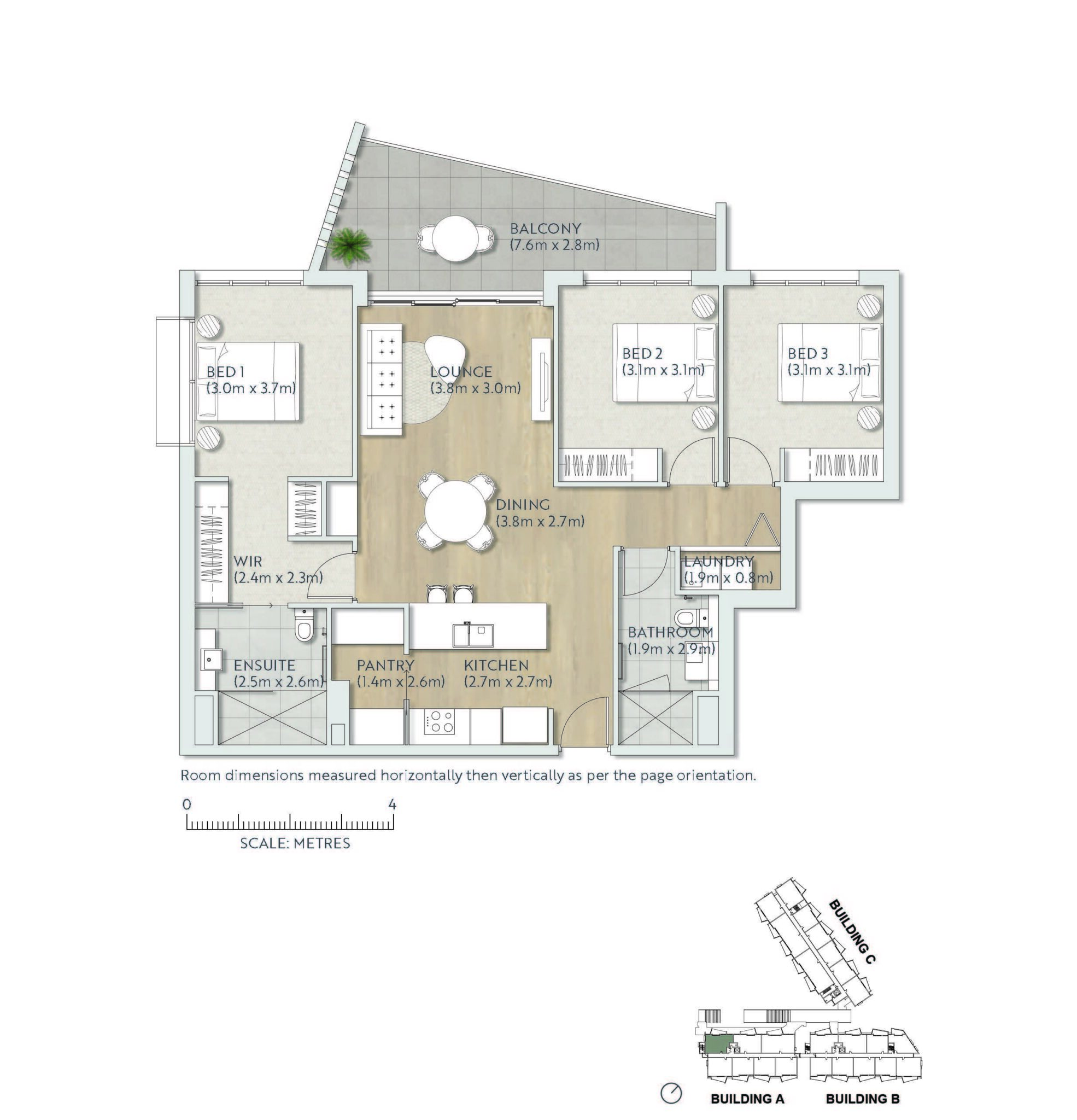 The thoughtful floor plan offers excellent separation – the main bedroom is privately positioned on one side of the living area, while the two additional bedrooms and bathroom are located at the opposite end, providing ideal space and privacy for family or guests.